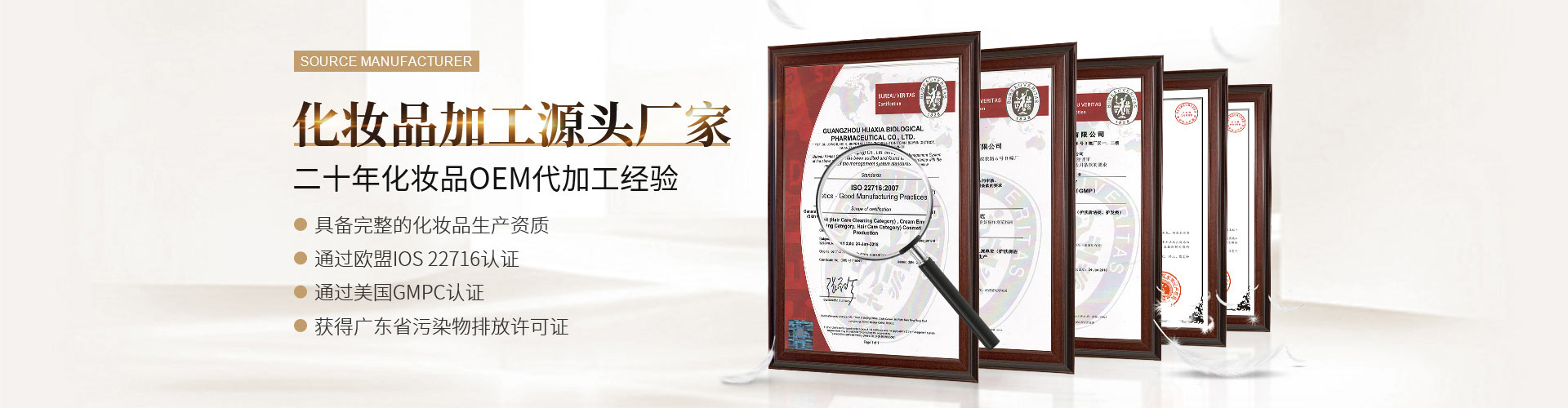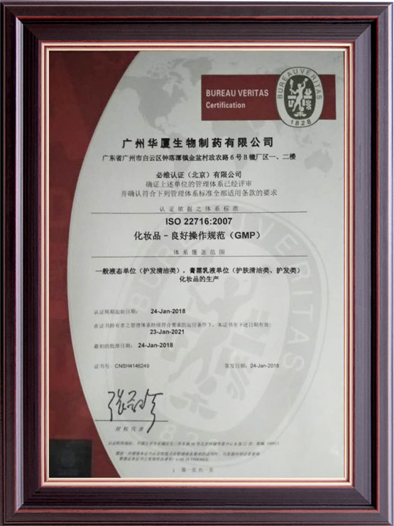 公司始創(chuàng)建于2012年,經(jīng)過八年的健康發(fā)展,已經(jīng)成為可以從事妝字號、消字號、械字號等系列產(chǎn)品生產(chǎn)加工的大型企業(yè)。企業(yè)坐落在美麗的廣州白云區(qū)鐘樓潭鎮(zhèn),擁有面積超過15,000平方米的生產(chǎn)廠房。廠房寬敞明亮,設(shè)計(jì)科學(xué)新進(jìn),擁有十萬級的生產(chǎn)車間,局部環(huán)境可以達(dá)到一萬級別;設(shè)備多采用新進(jìn)的進(jìn)口設(shè)備,自動(dòng)化程度非常高,擁有一流的生產(chǎn)設(shè)施。工廠同時(shí)通過了ISO22716和GMCP質(zhì)量管理認(rèn)證,擁有一流的質(zhì)量管理體系。廠