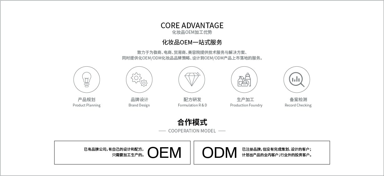 在華廈人八年的共同奮斗下,公司已經(jīng)成為一流的化妝品生產(chǎn)加工企業(yè),現(xiàn)擁有多項(xiàng)核心技術(shù)的科研產(chǎn)品成果,如純氨基酸洗護(hù)產(chǎn)品、純植物天然無化學(xué)來源護(hù)膚品、負(fù)離子植物抑菌防護(hù)技術(shù)、5D美白淡斑技術(shù)、基因蛋白抗衰技術(shù)、基因蛋白修護(hù)技術(shù)等。 為提高工廠的核心競爭力,公司跟國內(nèi)外科研單位共同組建了三大實(shí)驗(yàn)室:1.與美國Sino Lion共同組建研氨基酸表活研究實(shí)驗(yàn)室;2.與日本一丸公司共同組建了植物美白成分研發(fā)實(shí)驗(yàn)室;3.與華南理工大學(xué)共同成組建產(chǎn)品研發(fā)實(shí)驗(yàn)室。.....